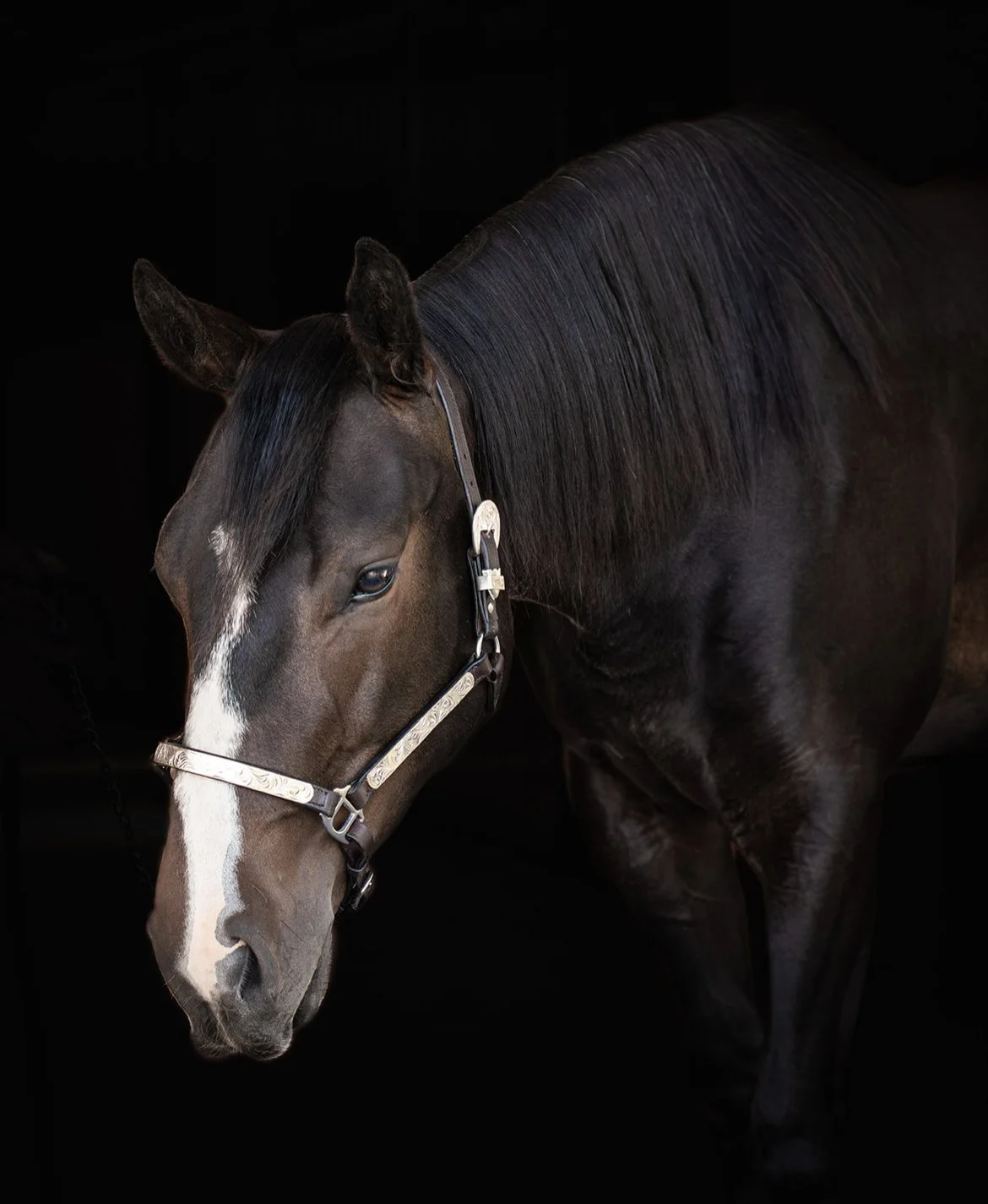 Snickers is a dark bay Quarter Horse mare . She has a steady slow pace and loves to take naps in her stall.